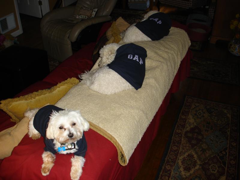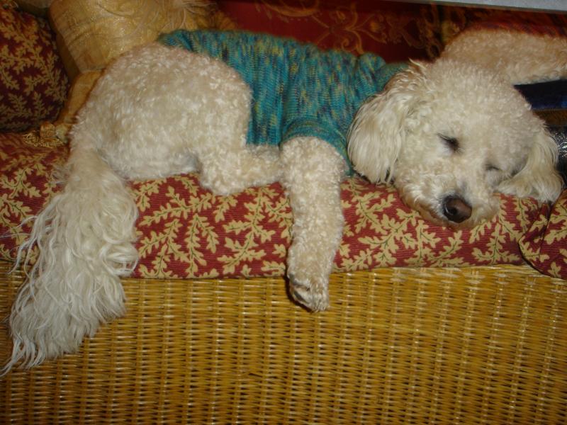 Toby testing a new sweater and pillow for comfort.
